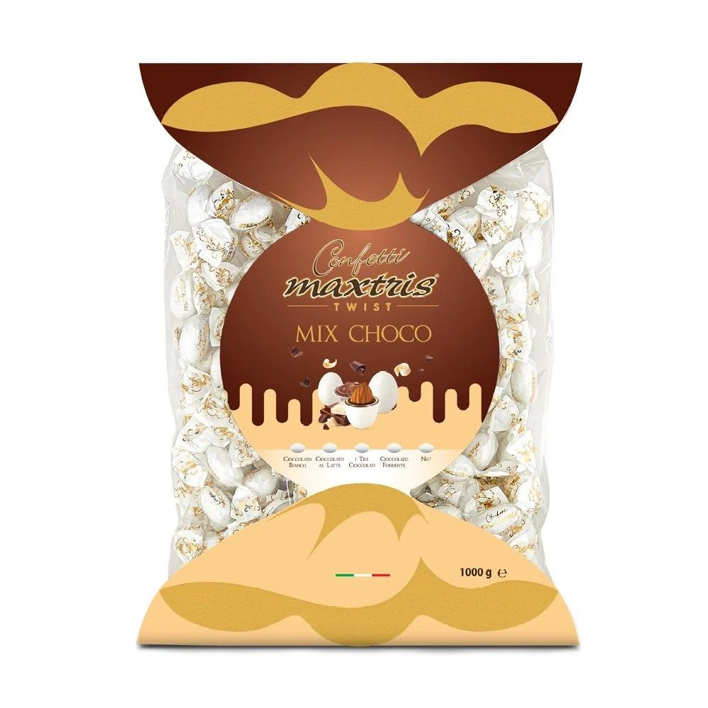Confetti Maxtris, Mix Choco Twist incartati singolarmente a caramella. Mandorla tostata avvolta da uno strato di cioccolato bianco assortito nei gusti (cioccolato bianco, cioccolato al latte, i tre cioccolati, cioccolato fondente e nut), ricoperta da un sottile strato di zucchero.