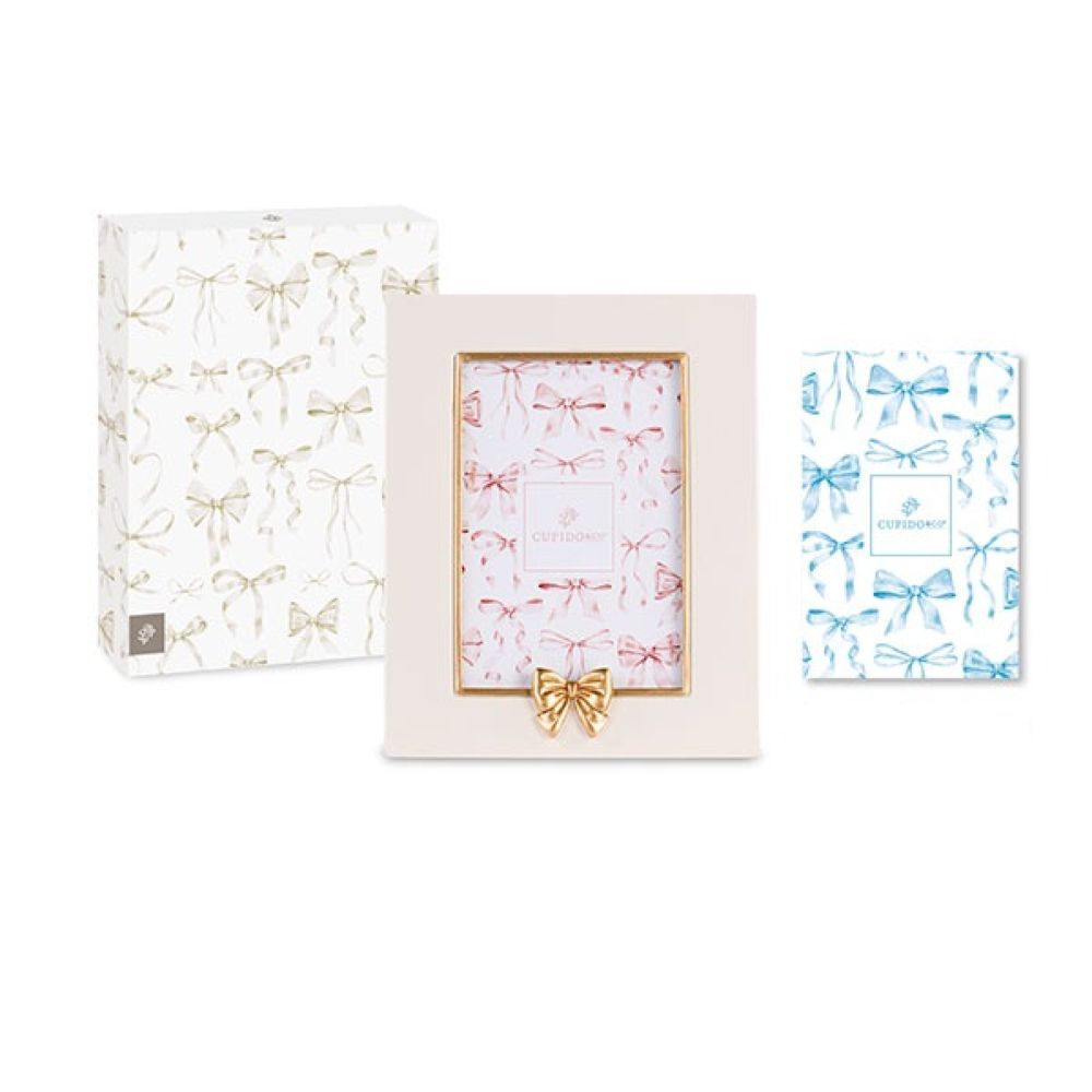 Cornice porta foto in resina con fiocco oro. Include scatola regalo. Con doppio inserto, sia rosa che celeste. Ideale come bomboniera o articolo da regalo.