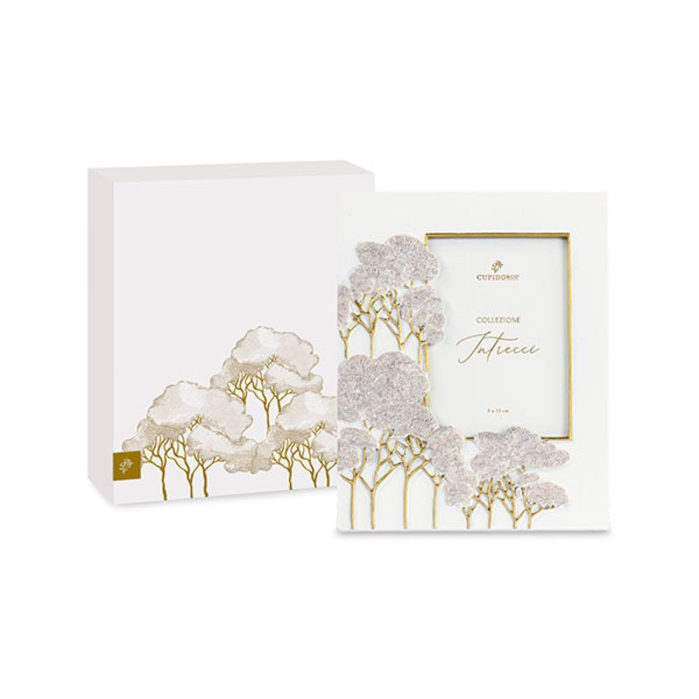 Cornice porta foto, Linea intrecci con alberi, di colore bianco e oro. Include scatola regalo. Ideale come bomboniera o articolo da regalo.