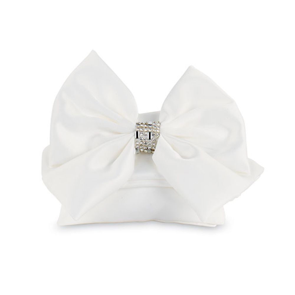 Pochette porta confetti con fiocco e strass di colore bianco. Bomboniera.