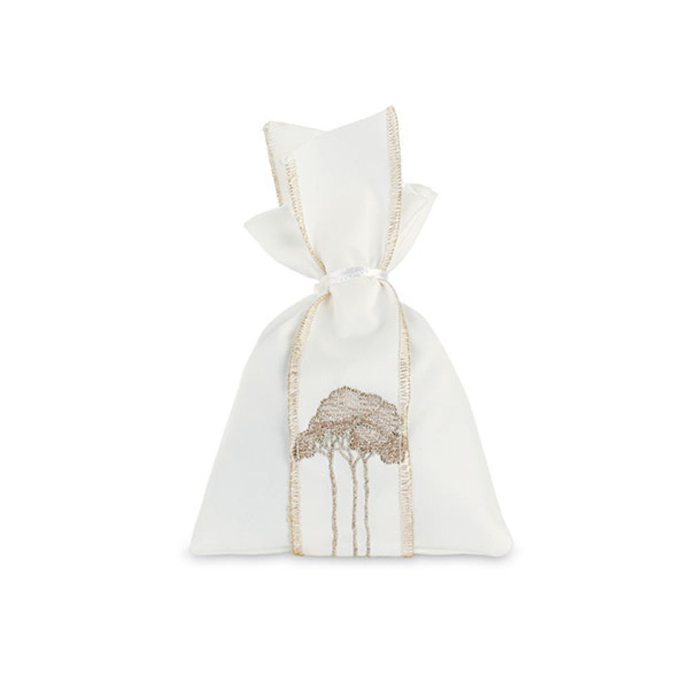 Sacchetti porta confetti in raso con fascetta alberi di colore bianco e oro. Bomboniera.