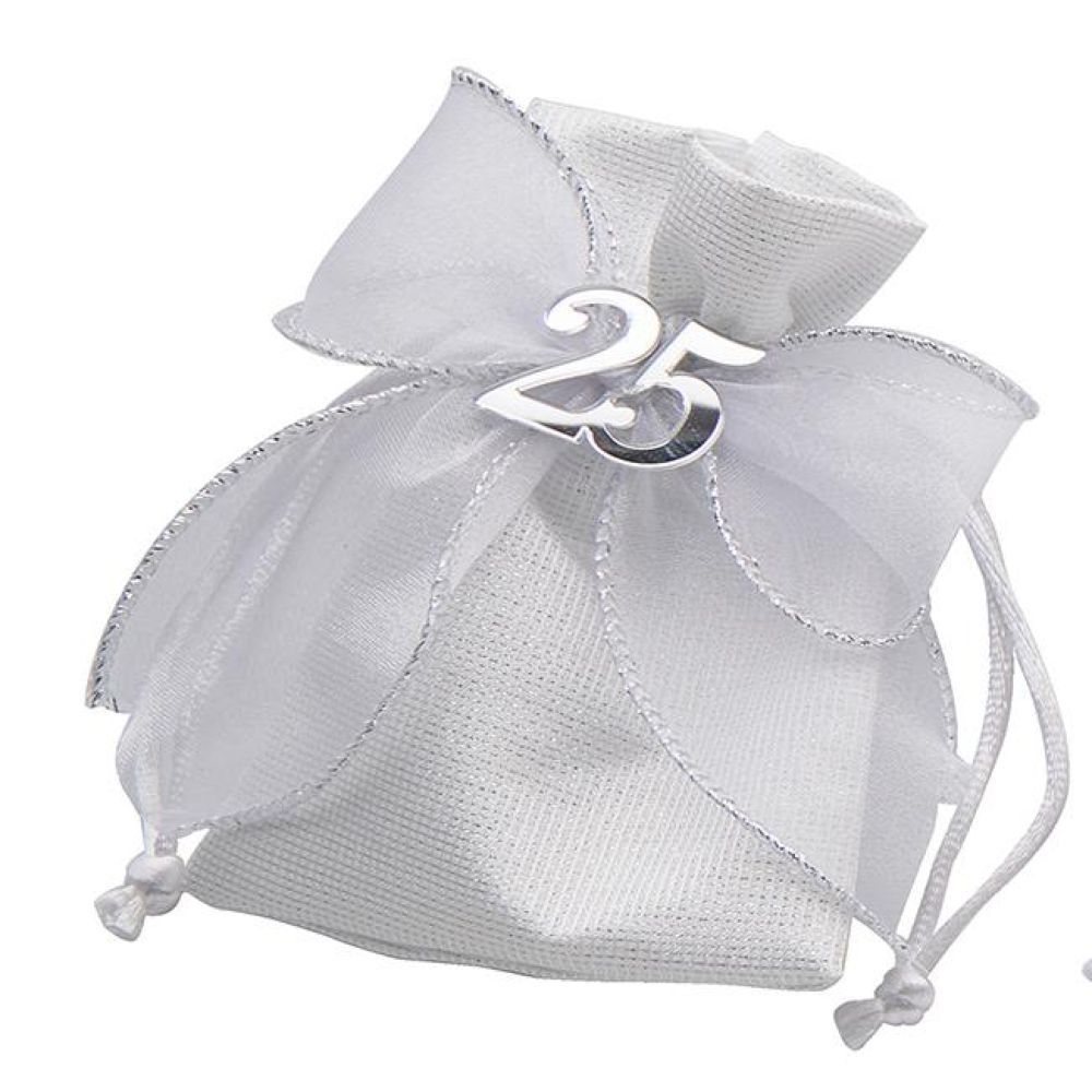 Sacchetto porta confetti Nozze d’Argento con fiocco e numero 25 in plexiglass. Bomboniera.