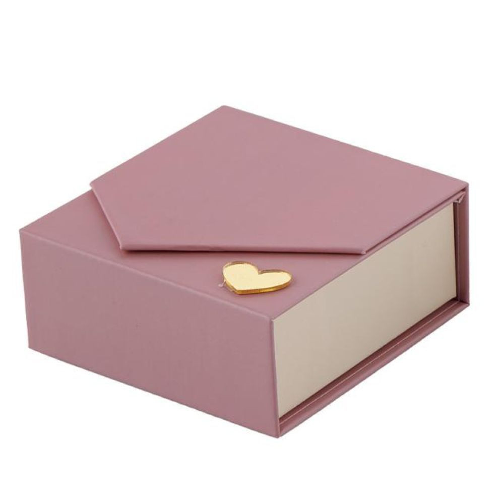 Scatola porta confetti telata con un cuore in plexiglass di colore malva. Scatolina Bomboniera.