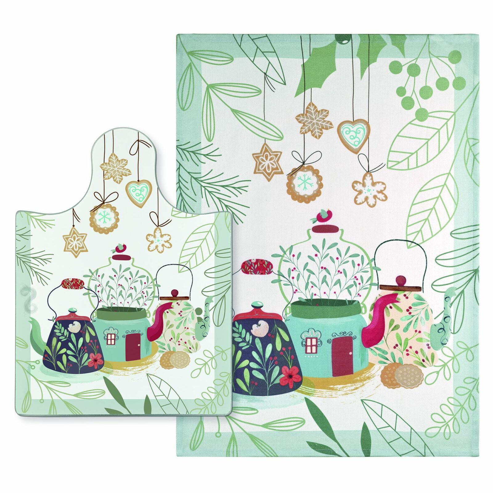 Tagliere in vetro temperato con decoro stampato di teiere, completo di strofinaccio coordinato. Resistente e versatile, è ideale anche come sottopentola o per servire a tavola con stile durante le feste!